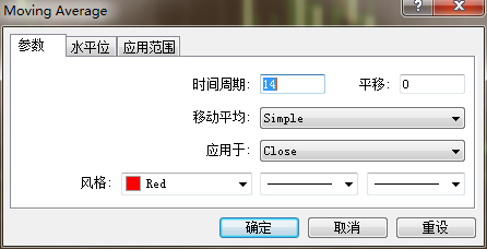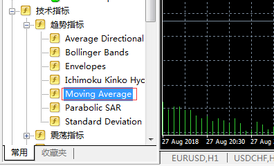 1、在MT4上导航界面,找到技术指标—趋势指标下的Moving Average。点击左键拖到图标页面,或者双击打开。