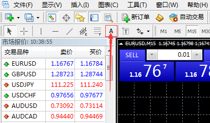 1、在MT4的上方点击文字插入。