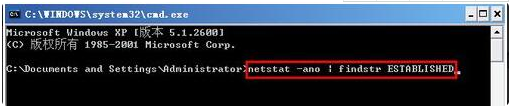 4、在弹出的界面输入:netstat -ano | findstr ESTABLISHED然后回车键确认。