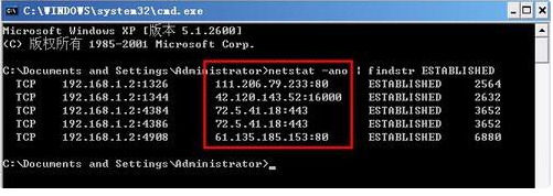 5、这个就是显示的我们电脑当前所打开所有的程序的IP地址。(注意最好关掉除MT4外的所有程序,这样就只会显示出要查询的MT4服务器地址。)