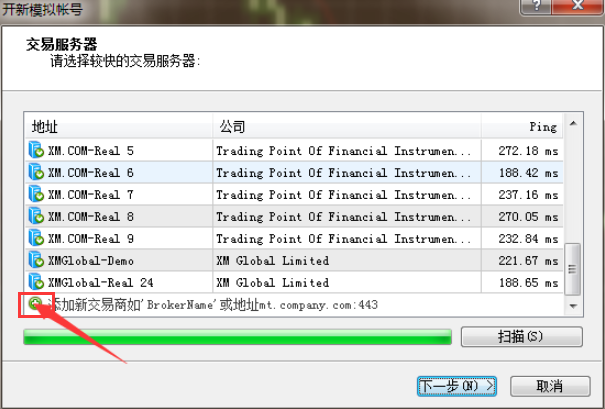 2、打开后点击“+”号,输入自己的交易账号,再点击扫描,只要交易账号正确,就能扫描出来。然后就会更新出自己账户的服务器。或者输入地址,这样也可以找出自己账户的服务器。