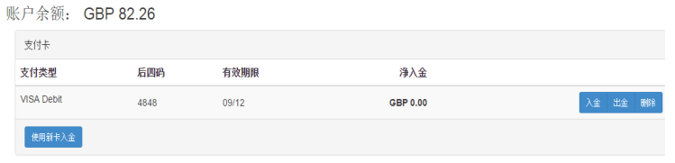 如果要取款到银行卡上,请选择右上角的 “ 客户端口 ” , “ 出入金 ” 之后,在 “ 支付卡”列表中点击想要使用的卡,选择“出金”。请注意该功能仅用于之前使用信用卡入金的客户,资金也只可以退回到之前所使用的信用卡上。