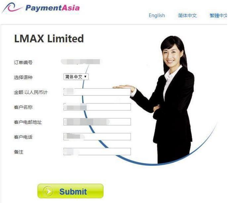 四、可以选择简体中文,输入人民币金额,您中文姓名,电话以及您在LMAX的邮箱,点击提交。
