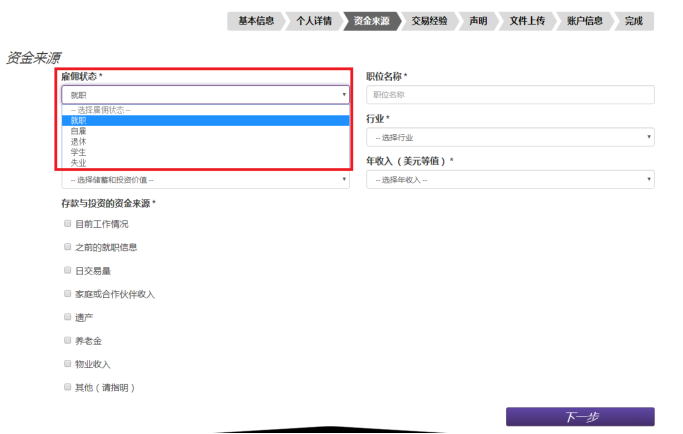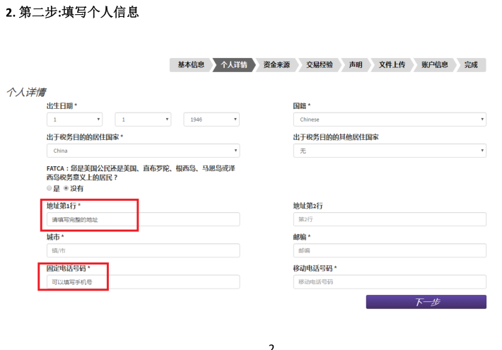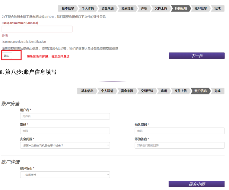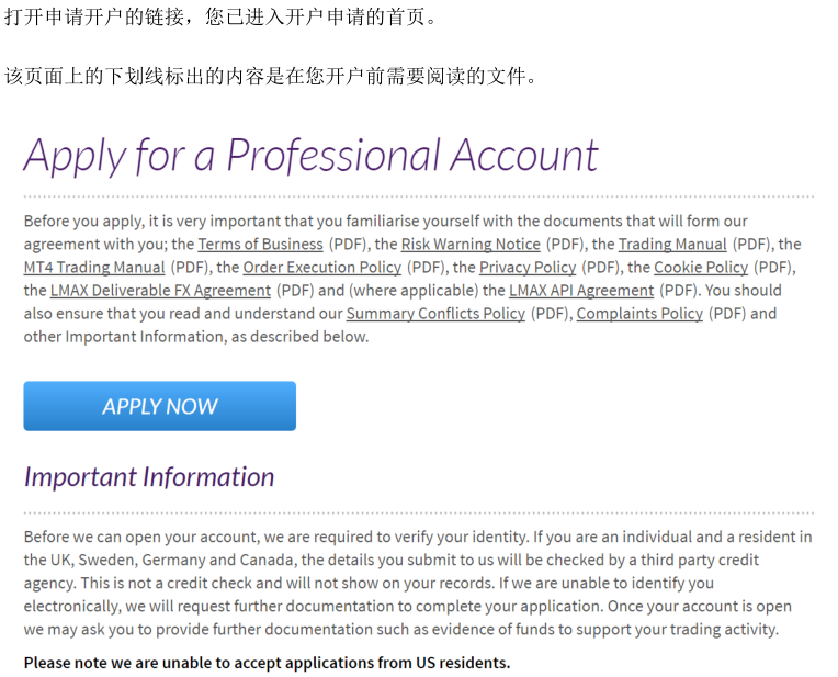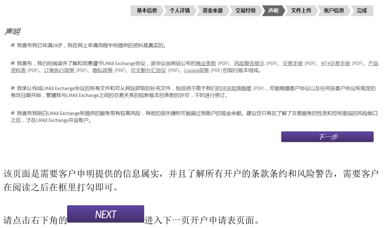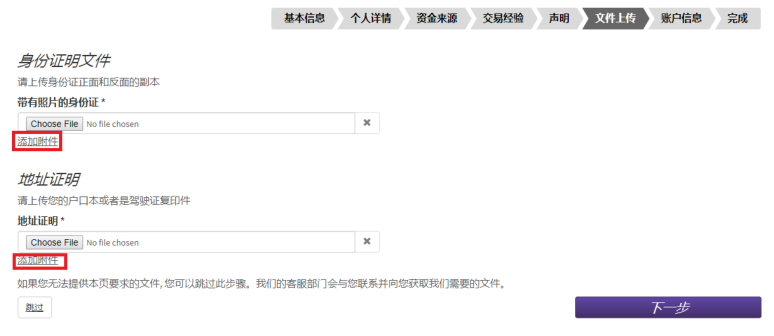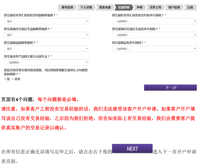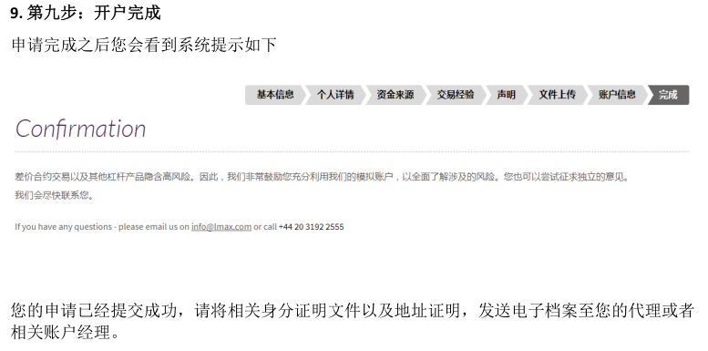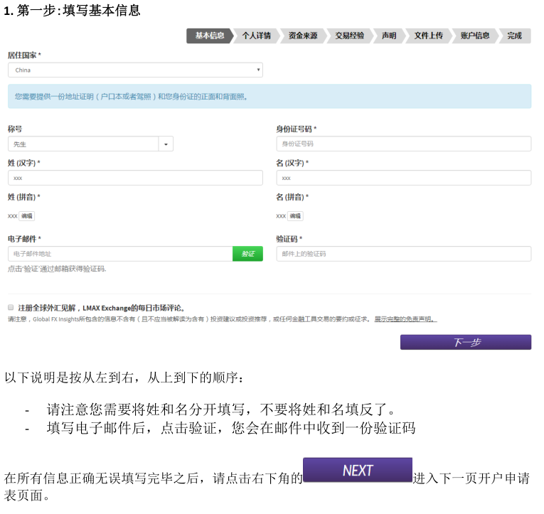 二、阅读完毕后, 点击页面上的APPLY NOW。如果电脑默认语言是中文,在选择国家China之后,跳转出来的页面会是中文的。 三、填写个人信息: 四、地址第一行和地址第二行: 如果地址过长,请将地址拆分到第一行和第二行中填写。 五、这部分的填写目标,是需要确认客户在进行外汇投资时有足够的财务成熟能力,整个页面分为两个部分: 1、客户职业信息;有 5个选项:就业,自雇,退休,学生,失业,其它。90%以上的客户属于就业和自雇的两种情况,区别是就业指在公司任职,自雇指自己开公司;对于其它选项(退休、学生、失业和其它)的客户,有可能需要对方提供财力证明,来确认客户有足够的财务承受能力(带有姓名,银行名称和 Logo,大于等于 1 万美金的银行存款截图就好)。 2、客户储蓄和投资(即流动资产)来源目前工作,之前工作:大多数客户的流动资产来自于这个部分,指通过工作收入累计。4日内交易:一般指通过证券,期货,外汇,保险等投资来获取资金的方式。家庭和合作伙伴收入:有两种情况,来自于亲人或合作伙伴的给予,还是为其委托理财。两种情况都在需要稍后的邮件中补充说明来源,性质和比例。需要提醒是,其他人的资金作为入金来源被视为第三方资金,在反洗钱法的要求下,可能不接受这部分资金。 上述这些信息的了解,是为了配合监管机构和反洗钱政策的要求,需要了解的是客户用来投资在LMAX做外汇交易这部分的资金,是来自于上述哪些部分,及各自的占比?如果不是作为在LMAX进行外汇投资的资金,不需要勾选来源选项。 完成后点击下一步,填写交易经验: 六、填写填写开户申明,上传资料。 七、如果当前居住的地址和身份证上的地址相同(网页申请表上 填写 的是和身份证上是相同的地址)。 请上传以下文件: 1)身份证正反面(彩色照片或扫描件) 2)和身份证有相同地址的证件的驾照 或者户口本(户主页和本人页) 如果您当前居住的地址和身份证上的地址不同(网页申请表上 填写 的是和身份证上不同的地址),请提供以下文件: 1)一份身份证明:身份证、驾照或者护照都可以作为身份证明。请提供清晰的彩色复印件或者是照片格式的文件。如果提供身份证,请同时提供正反面以确认有效时间。 2)两份地址证明:如果身份证上的地址和开户申请一样,身份证可以同时做为身份和地址证明,然后只要从下面的列表中选择提供一个相同地址的地址证明即可。如果地址不同,就需要提供两份地址证明。可以接受户口本、驾照、水电气费账单、有线电视账单、固定电话账单、宽带账单、银行帐单、信用卡账单。账单需要是一份最近3个月内发行的。如果决定上传资料,请确保身份证、驾照或者户口本显示是同样的地址。在上传多份资料的时候,请选择添加附件,以添加。完成后点击下一步。 密码:可自行设置,为 8‐20 个字节,包括至少一个字母和一个数字。 请记下为自己预设的登陆用户名和密码,在账户开通后,不会再次。如果忘记密码,可以联系客户或在代理的协助下找回密码。 账户货币,一般请选择美元(USD Dollar)。如果需要其他货币账户,请首先和代理或者客户经理沟通。 最后点击提交申请就可以了。 |